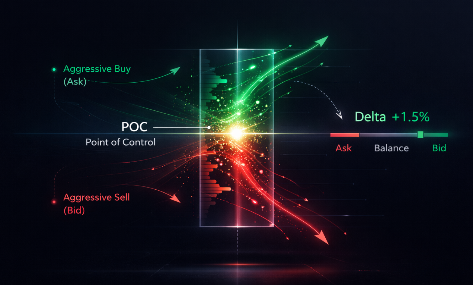 - 5–10% — серая зона, смотрим контекст: совпадает ли дельта с направлением свечи, есть ли имбалансы внутри.