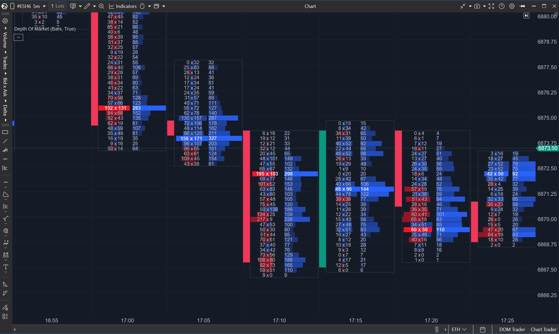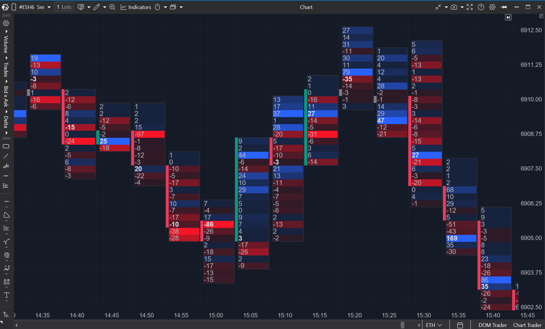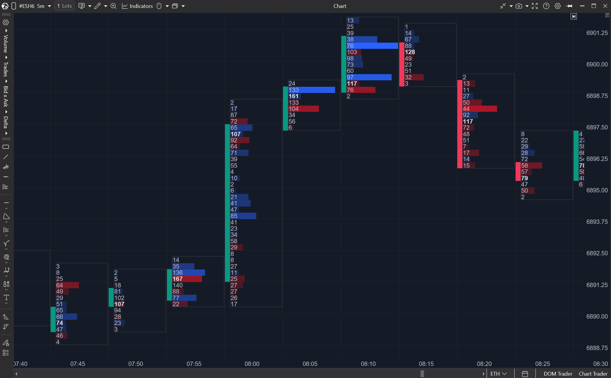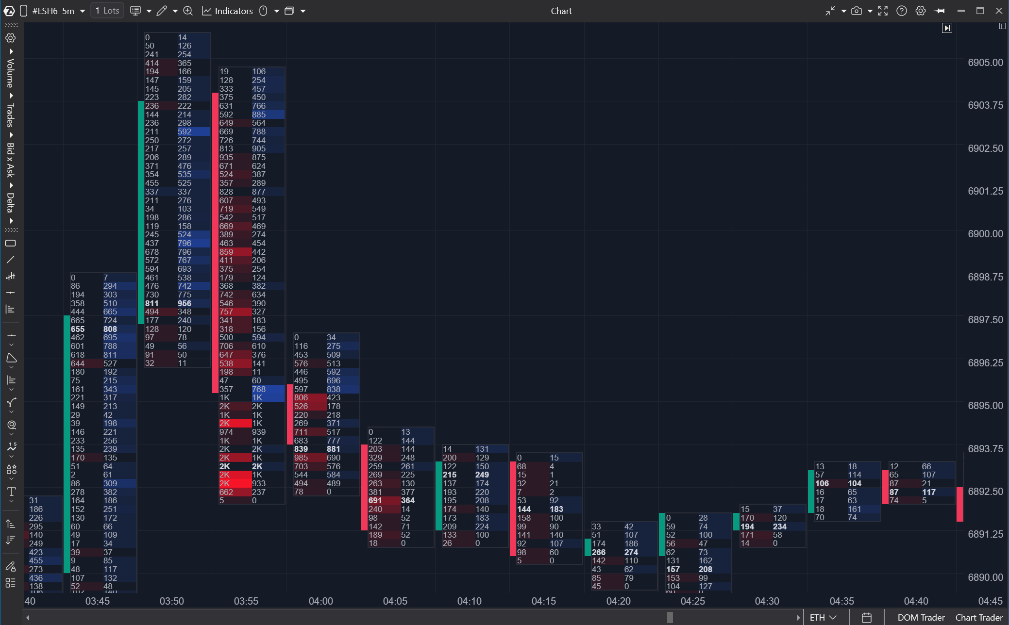 Платформа ATAS также позволяет комбинировать разные типы футпринт данных в каждой свечке. К примеру, на картинке ниже вы видите Bid Ask профиль раскрашенный по дельте, рядом стоит Volume Profile. Максимум информации, ничего не упущено.